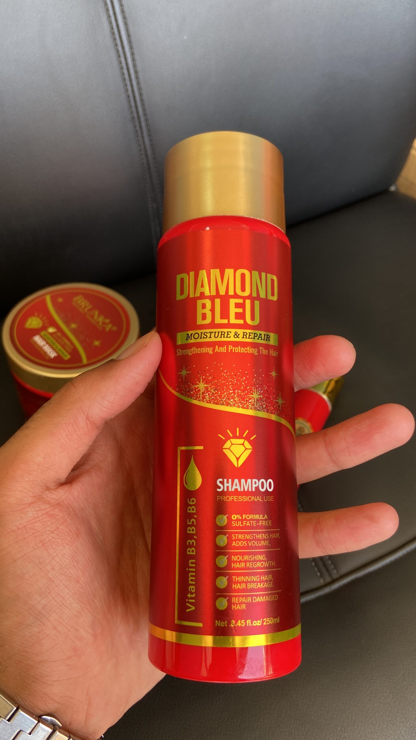 Diamond Bleu Moisture & Repair Shampoo (250ml) – gently cleanses while strengthening and protecting hair, enriched with Vitamin B3, B5, and B6.